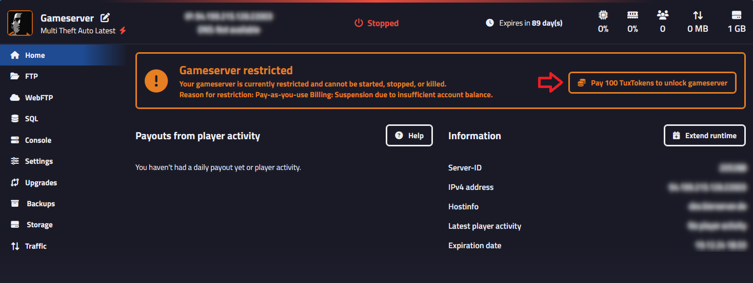 You can unlock your gameserver yourself by clicking the button in the notification within the GSM to pay the outstanding traffic costs. Please make sure your account has enough TuxTokens to cover the unpaid traffic fees.